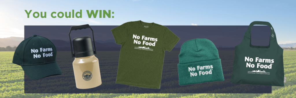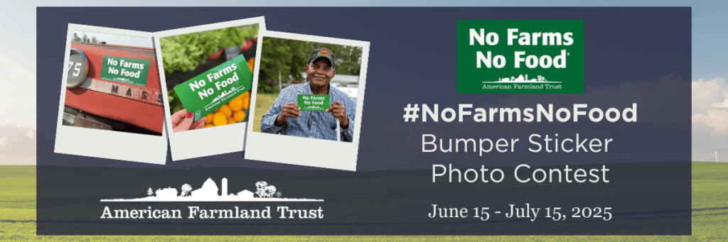 How to Enter: No purchase necessary. Post an original photo of your No Farms No Food® bumper sticker on your public Instagram account, tag @americanfarmlandtrust, and include both hashtags #NoFarmsNoFood and #NoFarmsNoFoodContest. Limit one entry per person.